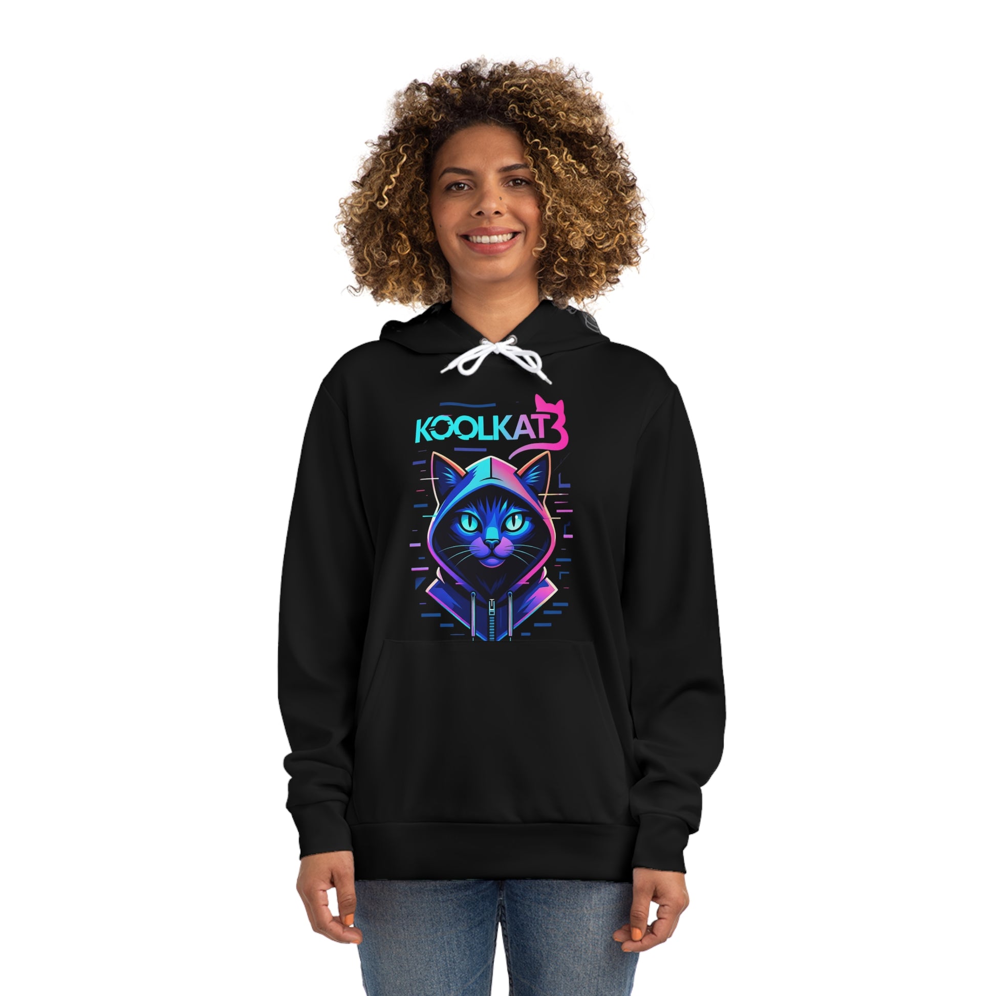 Slide into a hoodie that feels like a midnight neon alley — bold, playful, and a little mysterious. The front shows a stylized cyber-cat rendered in electric blues, pinks, and purples, its gaze lit with retro-futurist glow and the word KOOLKAT above. Wear it when you want to stand out during late-night meetups, arcade runs, or while sketching tracks in a dim café. The medium-heavy fabric holds the print’s crisp lines and keeps you warm without feeling bulky. A roomy kangaroo pocket and an adjustable hood add everyday practicality, while clean double-stitched seams promise long wear. This piece slips effortlessly into streetwear rotations, stream sessions, and creative nights — for anyone who likes a splash of neon attitude in their wardrobe.